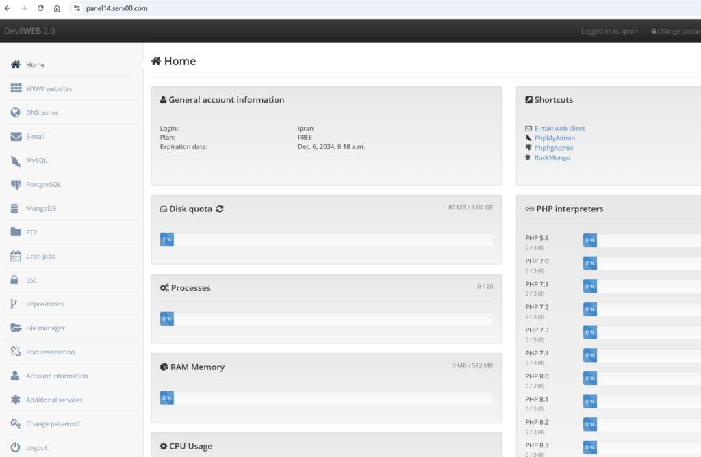 提供3GB容量SSD存储空间,不限单个文件大小,不限月流量,支持PHP(可切换版本)、Python、Ruby、Node.js、Java、TCL/TK、Go、Rust、RoR、C++、Django等。Serv00免费空间提供yourname.serv00.net免费二级域名1个,可以绑定自己的域名,最多可创建100个网站,可创建10个MySQL、3个PostgreSQL和3个MongoDB数据库,3个GIT/SVN/HG仓库,支持SSH,可开启3个TCP/UDP端口,FTP、在线方式上传管理文件,可签发部署Let’s Encrypt的SSL证书,每日自动备份(保存7天)。